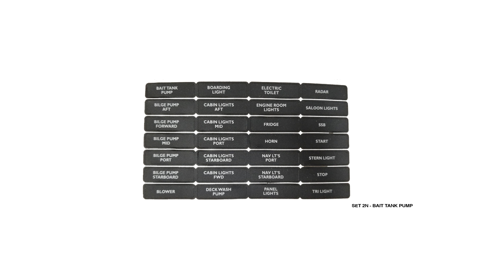 Bait Tank Pump, Bilge Pump Aft, Bilge Pump Forward, Bilge Pump Mid, Bilge Pump Port, Bilge Pump Starboard, Blower, Boarding Light, Cabin Lights Aft, Cabin Lights Fwd, Cabin Lights Mid, Cabin Lights Port, Cabin Lights Starboard, Deck Wash Pump, Electric Toilet, Engine Room Lights, Fridge, Horn, Nav Lt’s Port, Nav Lights Starboard, Panel Lights, Radar, Saloon Lights, SSB, Start, Stern Light, Stop, Tri Light