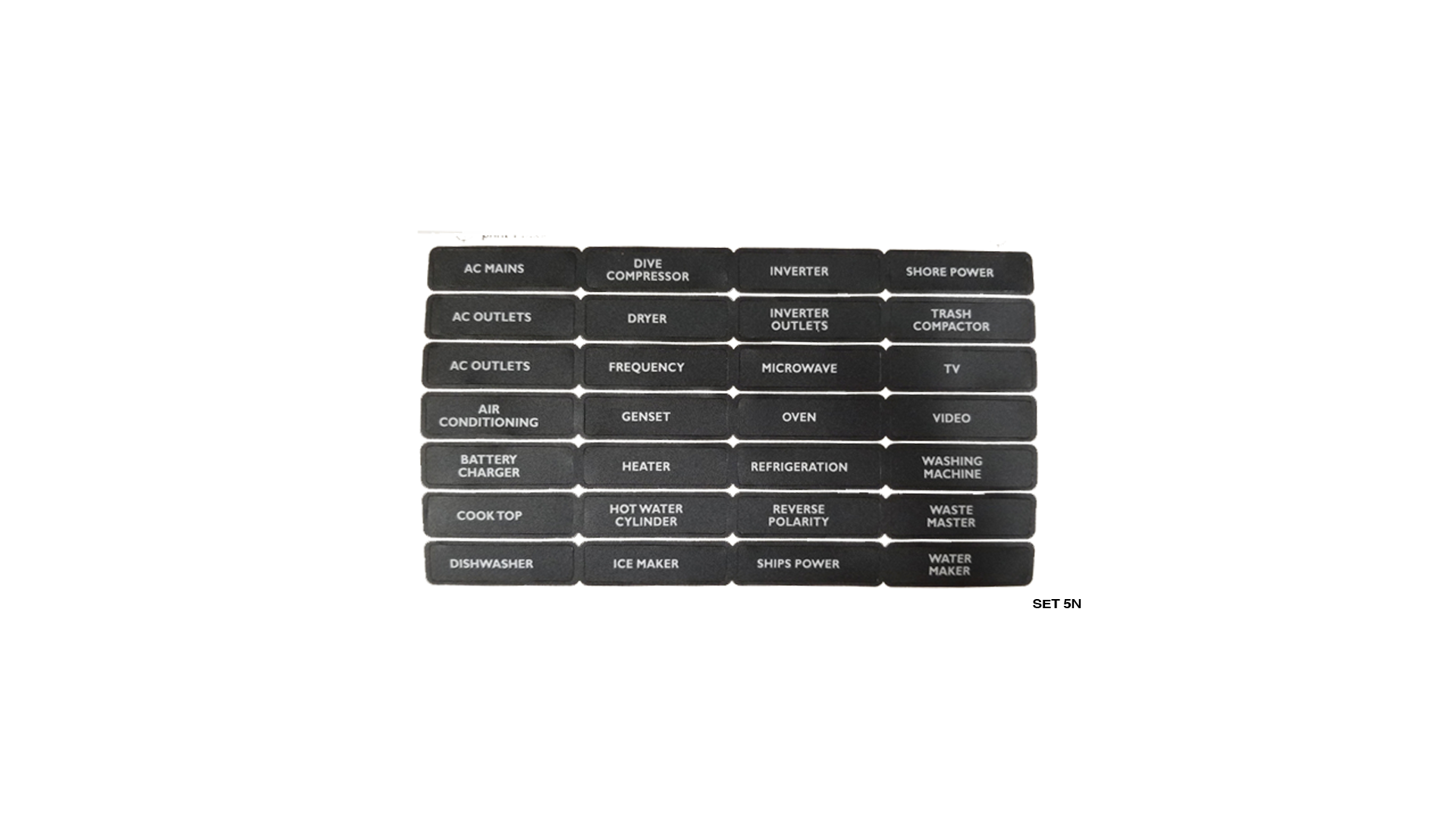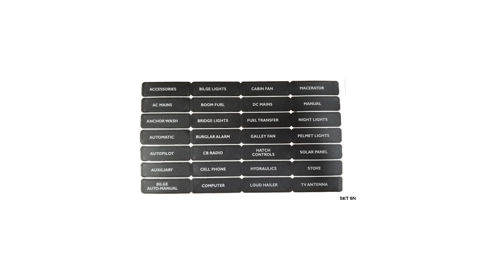 AC Mains, Accessories, Anchor Wash, Automatic, Autopilot, Auxiliary, Bilge Auto Manual, Bilge Lights, Boom Furl, Bridge Lights, Burglar Alarm, Cabin Fan, CB Radio, Cell Phone, Computer, DC Mains, Fuel Transfer, Galley Fan, Hatch Controls, Hydraulics, Loud Hailer, Macerator, Manual ,Night Lights, Pelmet Lights, Solar Panel, Stove, TV Antenna
