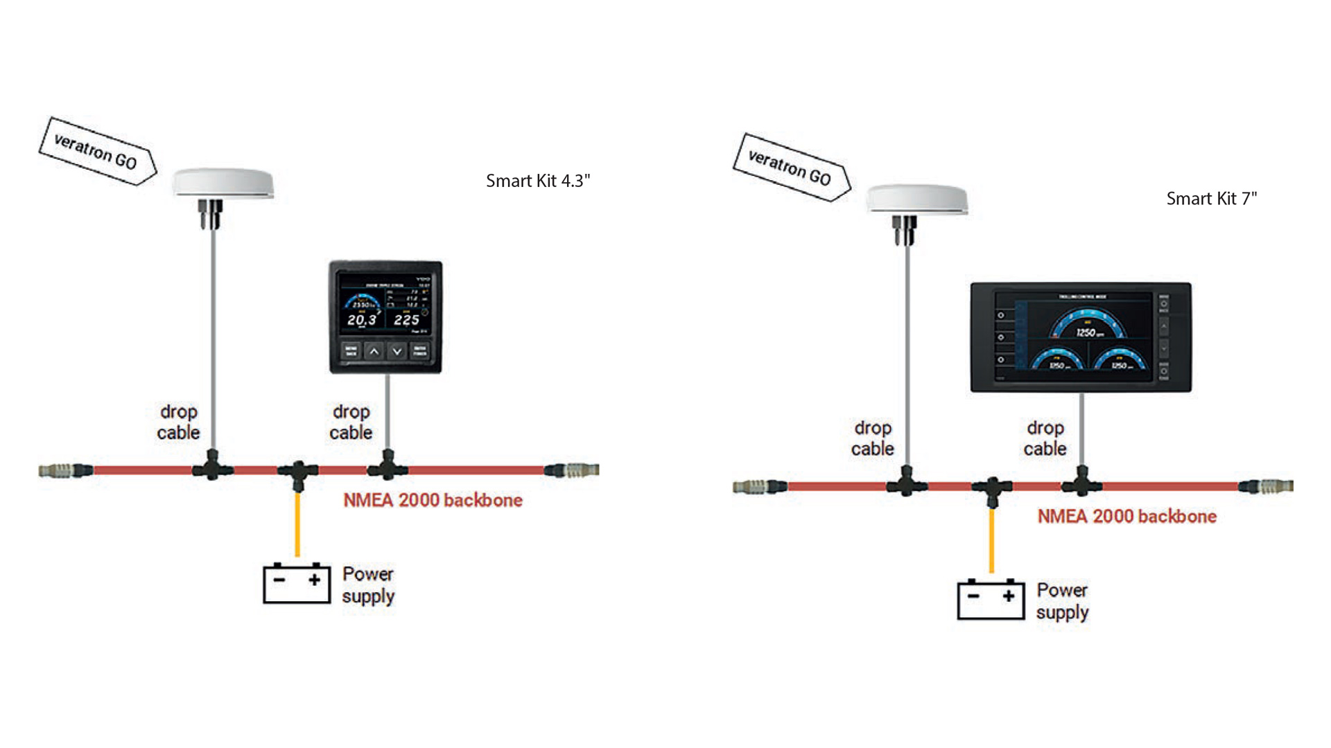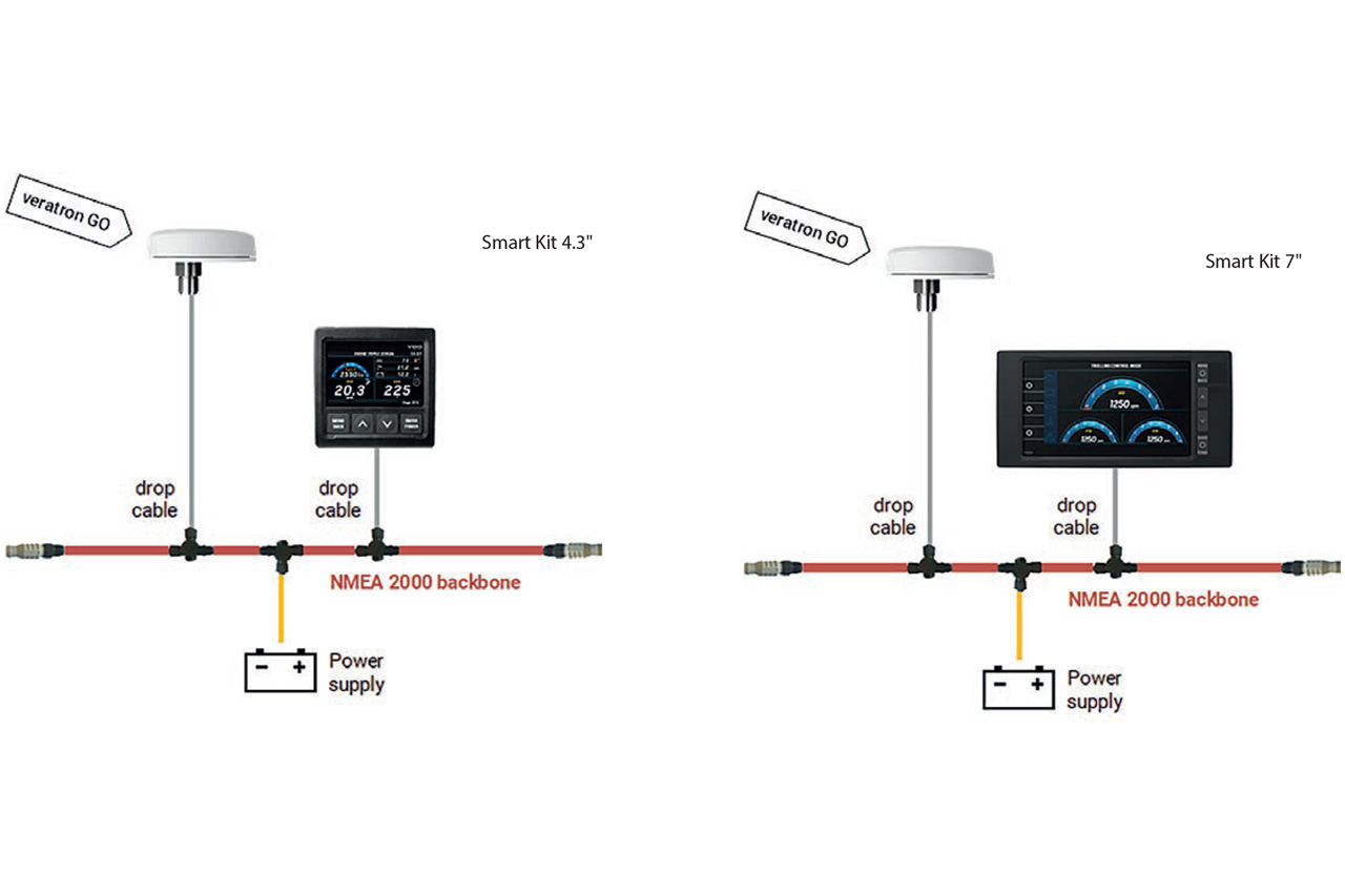 Lo Smart Kit è composto da un display TFT OceanLink da 4.3” o da 7.0”, dal nuovo modulo GPS Veratron GO, e da tutti i cablaggi necessari per l’installazione e la connessione. Tutti i dati vengono visualizzati sul display TFT