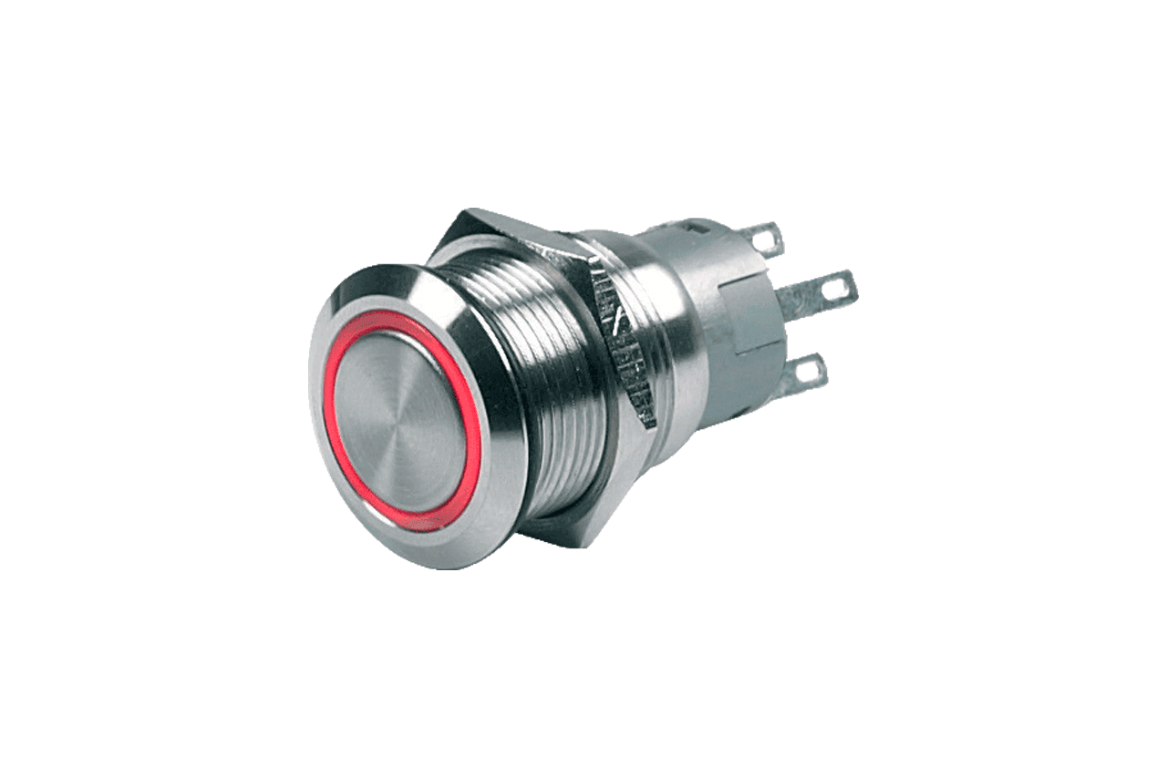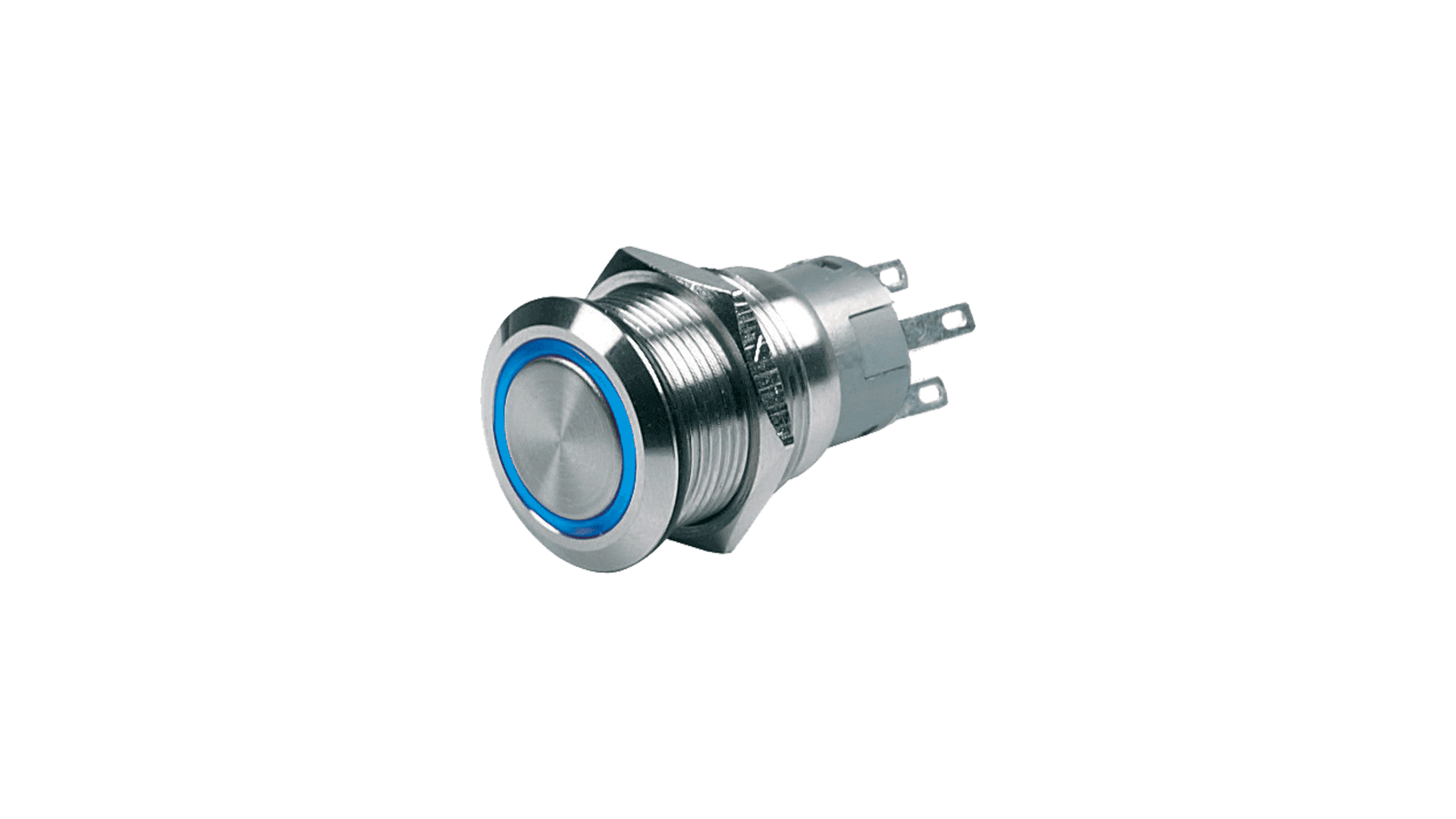 The through panel mount switches are ideal for lighting, switch, or dash panels, with colored rings that can be wired to either display power to the system or switch back lighting.