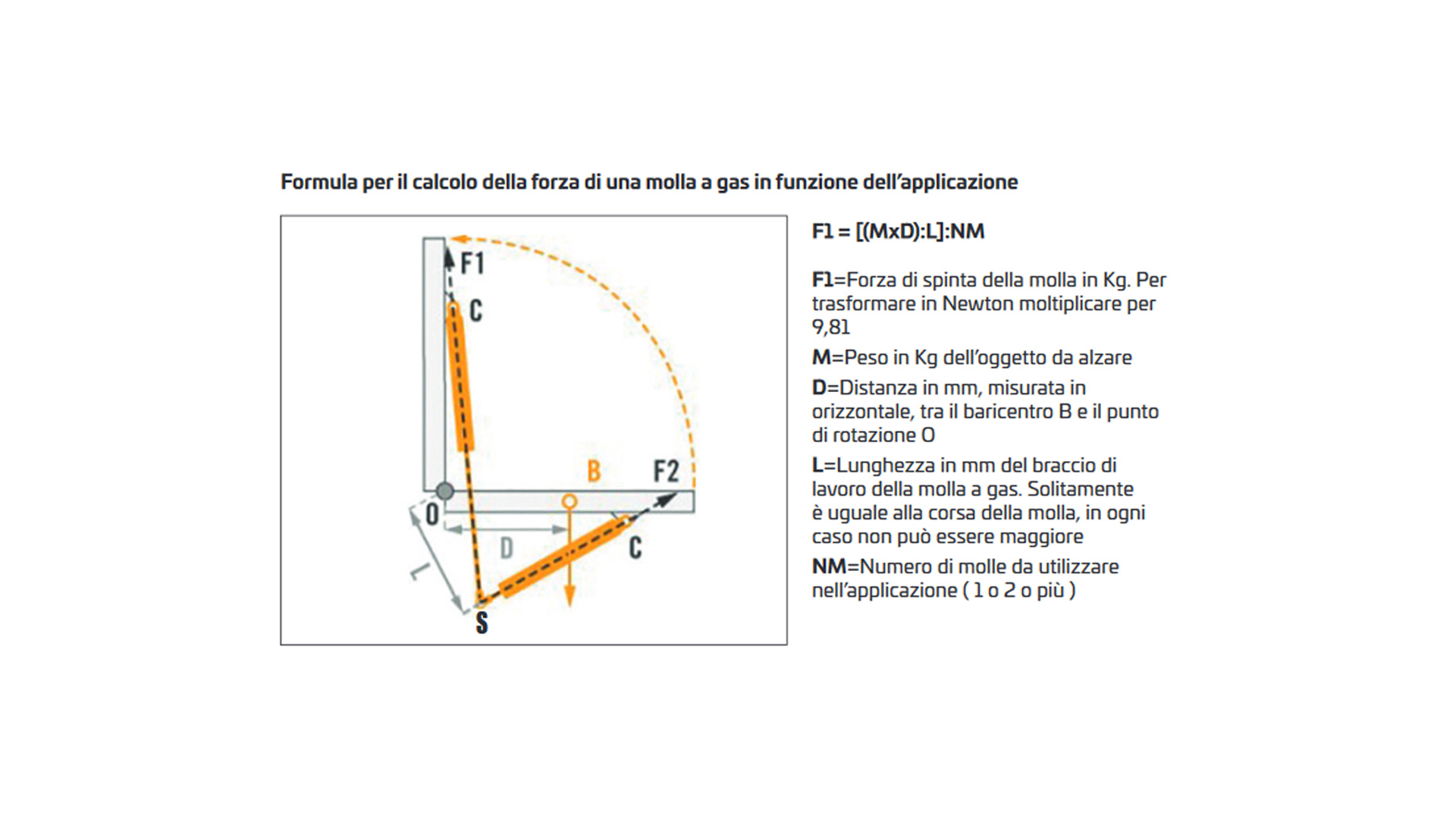 L=Length in mm of the gas spring working arm; most of the time it is equal to the stroke of the gas spring and in case cannot be greater.