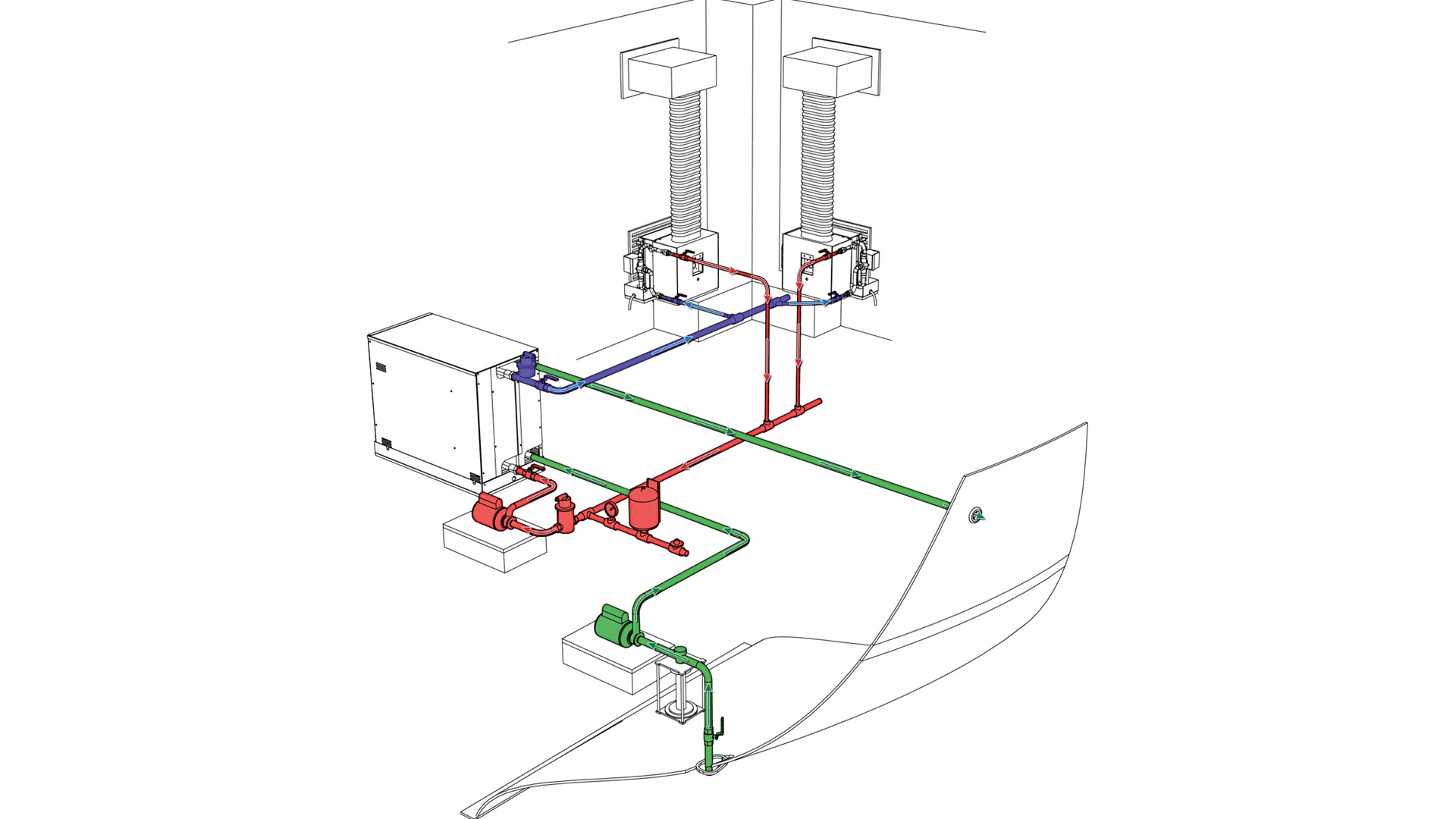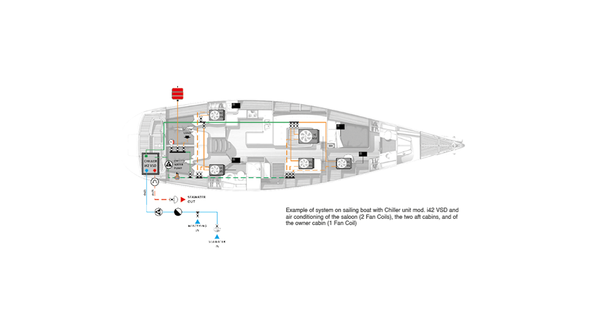 • Seawater loop components (sea water intake, water outlet, strainer, safety valve and pipeline)