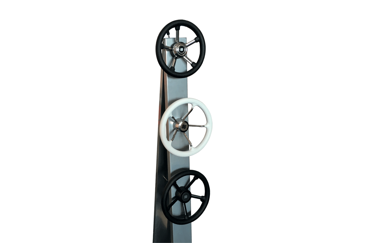 IMG 1-2: Fashionable dismountable steering wheels display in light gray painted metal.
